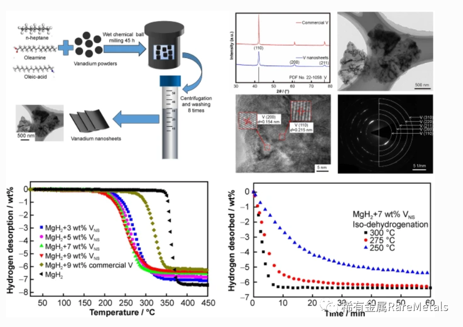 日前,江蘇科技大學(xué)能源與動(dòng)力學(xué)院的張劉挺副教授課題組在Rare Metals上發(fā)表了題為“Two-dimensional vanadium nanosheets as a remarkably effective catalyst for hydrogen storage in MgH2”的研究文章, 利用濕化學(xué)球磨法制備的二維釩納米片來改善MgH2的吸放氫動(dòng)力學(xué)性能。