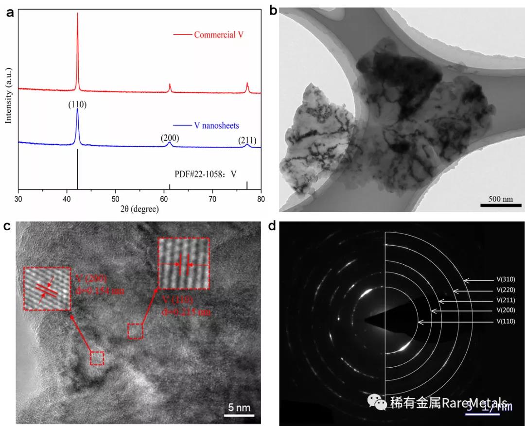 圖2(a) 釩納米片的XRD圖,圖2(b) 釩納米片的TEM圖,圖2(c) 釩納米片的HRTEM圖,圖2(d) 釩納米片的SAED圖