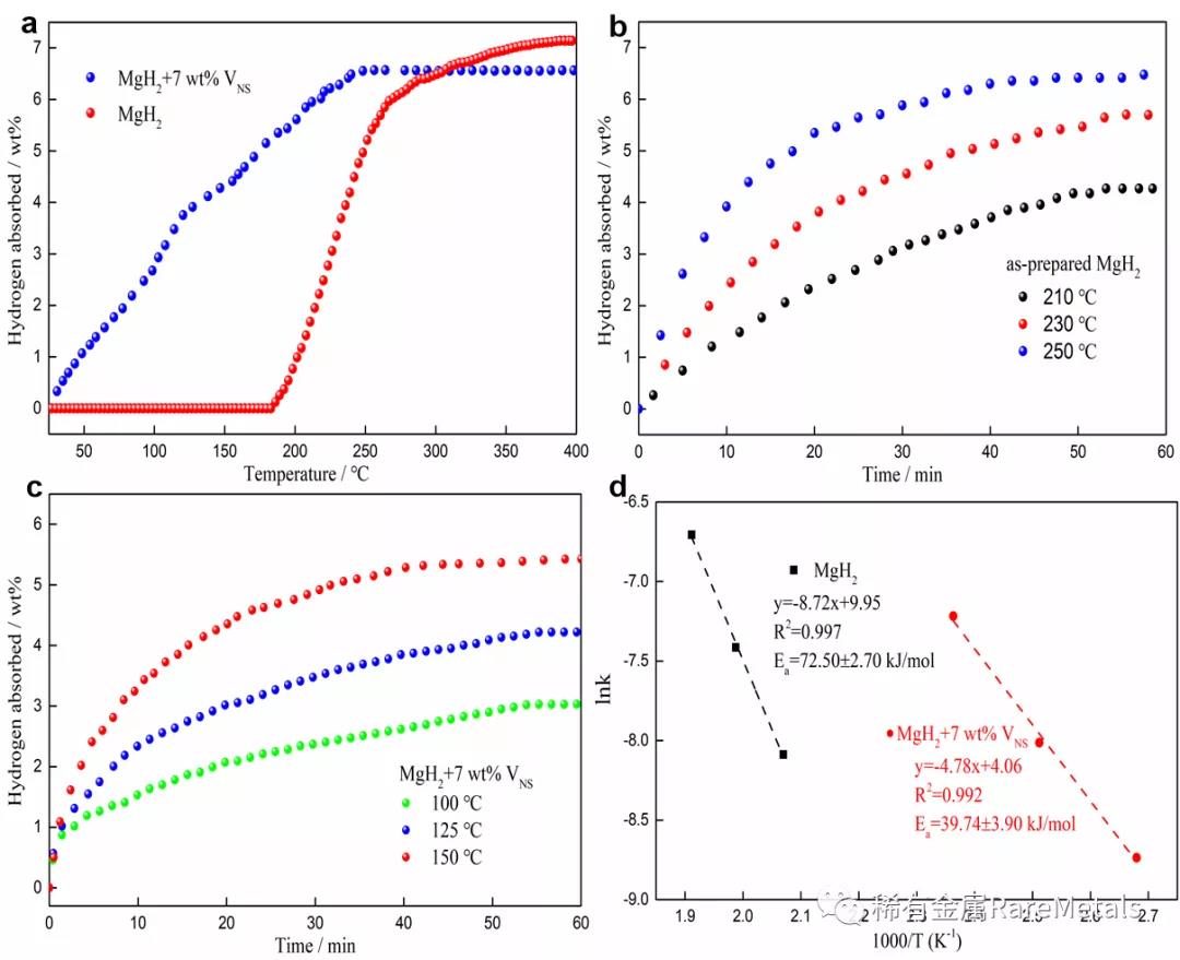 圖5(a)制備的MgH2與MgH2+7 wt% VNS升溫吸氫圖,圖5(b) MgH2在不同溫度下恒溫吸氫圖,圖5(c) MgH2+7 wt% VNS在不同溫度下恒溫吸氫圖,圖5(d) 計(jì)算的吸氫活化能圖
