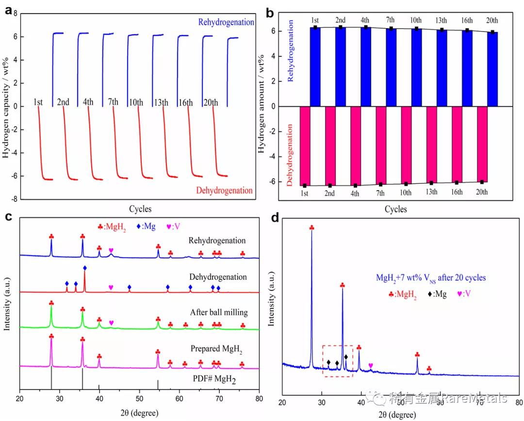 圖6(a) MgH2+7 wt% VNS 循環(huán)吸放氫圖,圖6(b) MgH2+7 wt% VNS 循環(huán)吸放氫容量柱狀圖,圖6(c) MgH2與MgH2+7 wt% VNS在各狀態(tài)下XRD圖,圖6(d) MgH2+7 wt% VNS在20次循環(huán)放氫后XRD圖