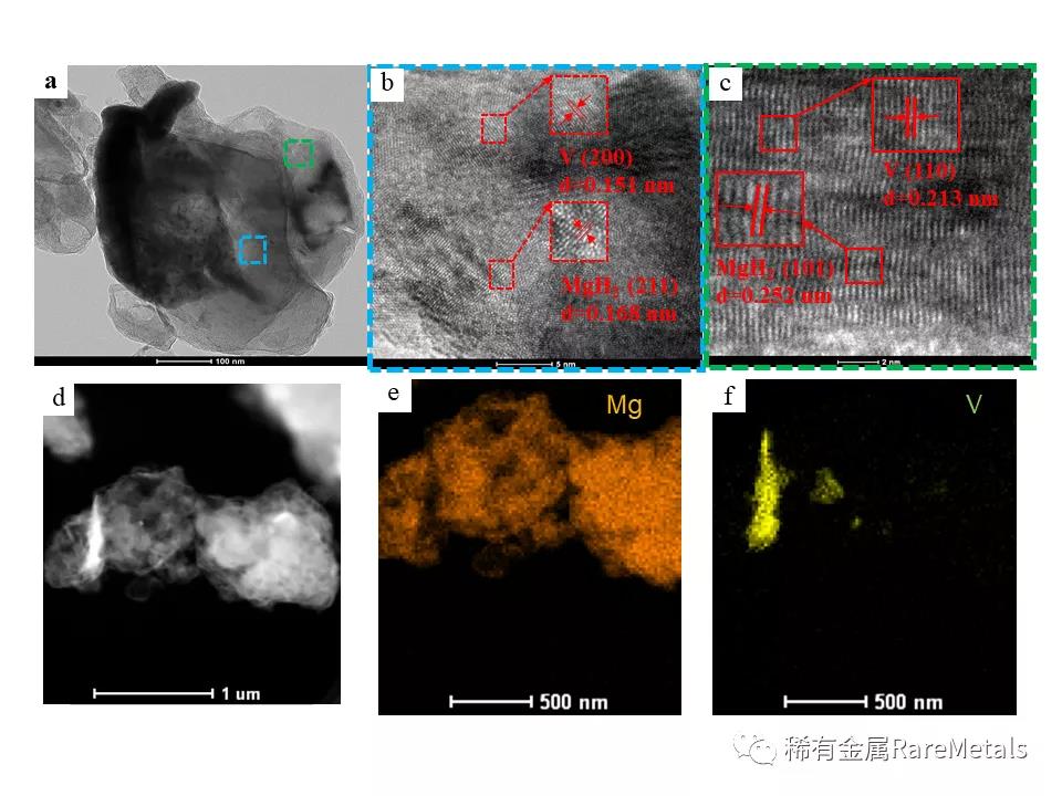 圖7(a) MgH2+7 wt% VNS 復(fù)合材料TEM圖,圖7(b),圖7(c) MgH2+7 wt% VNS 復(fù)合材料HRTEM圖,圖7(d) STEM-HAADF圖,圖7(e),圖7(f) 能譜圖