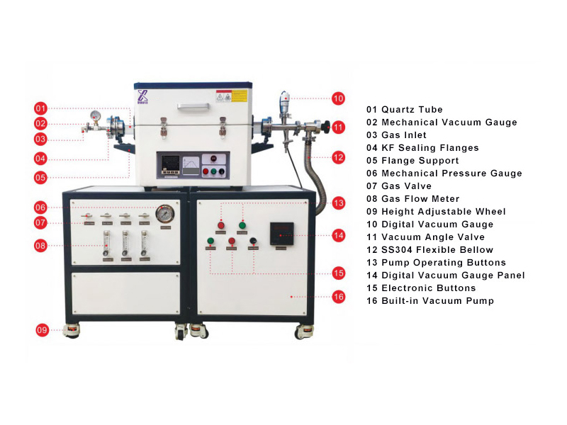 1. Optional rotary vane vacuum pump (vacuum degree ≤ 5pa 2. Optional digital vacuum gauge (1.0×105-1.0×10-1pa) 3. Optional float flowmeter (range 60-600ml/min) 4. Optional with quartz boat |