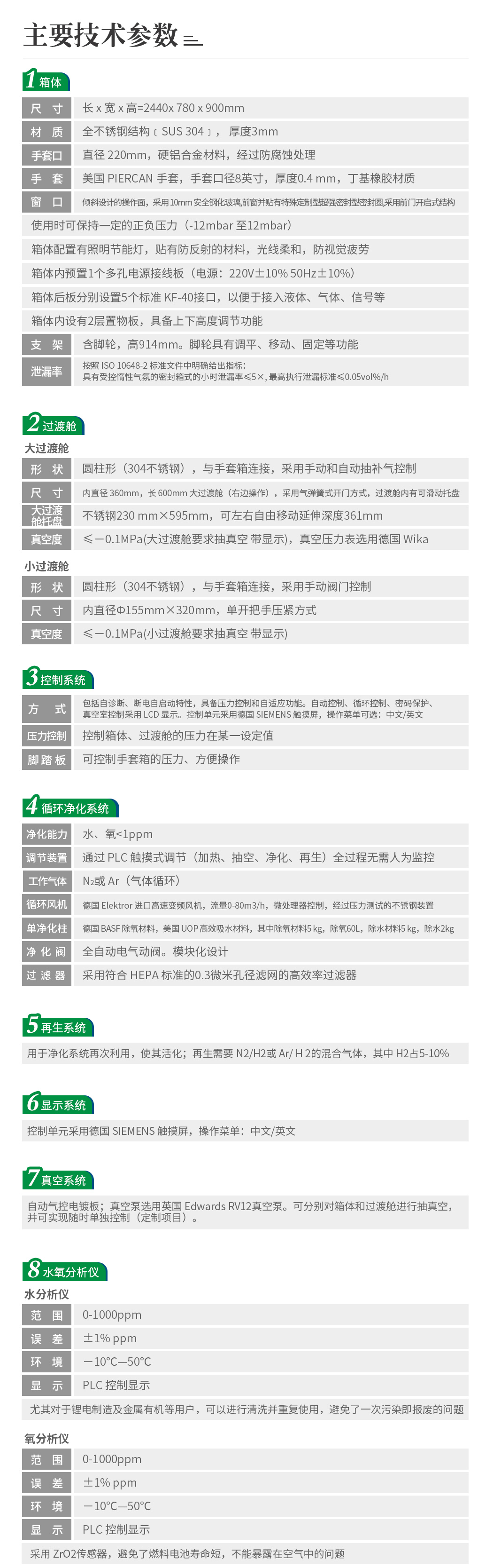 簡(jiǎn)要描述:1、不銹鋼的箱體,尺寸2440(長(zhǎng))X750(寬)X900(高)mm ,四個(gè)手套口 2、不銹鋼制成的大真空過(guò)渡艙,右置或左置,尺寸:直徑¢360mm,長(zhǎng)度600mm 3、小的真空過(guò)渡艙,與大過(guò)渡室同側(cè)布置,尺寸:直徑¢150mm,長(zhǎng)度300mm