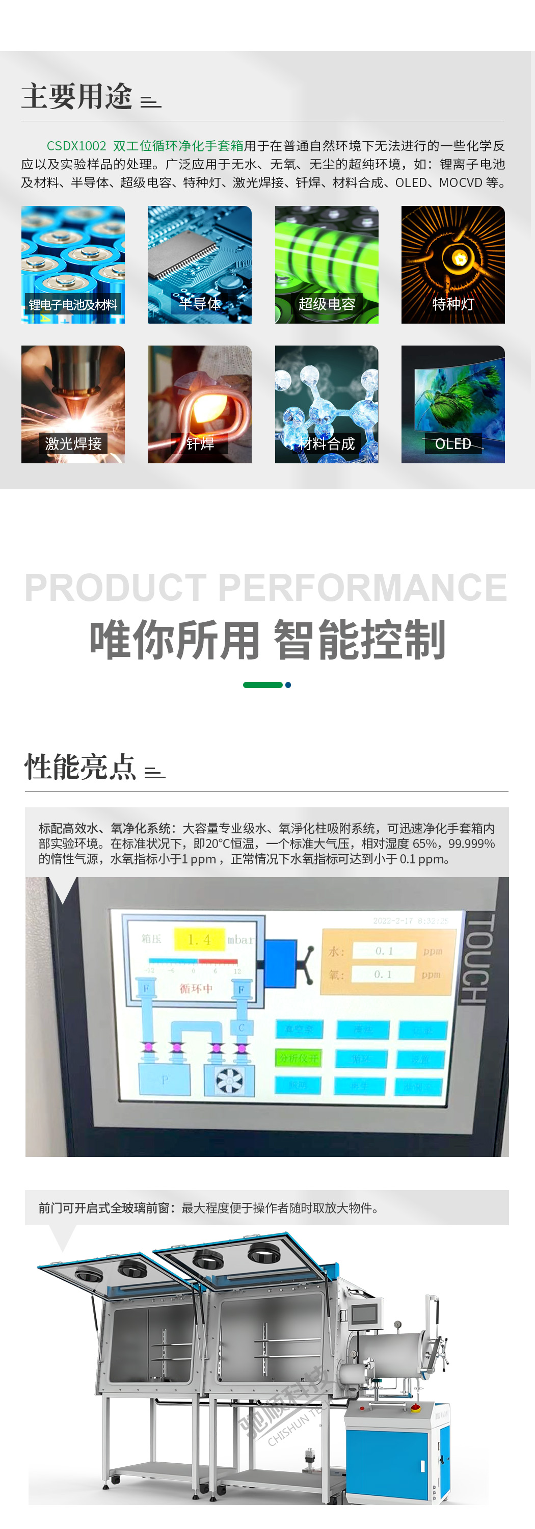 在化學(xué)反應(yīng)以及實(shí)驗(yàn)樣品的處理中,有些物質(zhì)對(duì)水和氧都十分敏感,在普通自然環(huán)境下無(wú)法進(jìn)行。使用循環(huán)凈化手套箱可使這類物質(zhì)在相對(duì)無(wú)氧、無(wú)水的惰性氣體環(huán)境下反應(yīng)和測(cè)試。 產(chǎn)品廣泛應(yīng)用于鋰離子電池及材料、半導(dǎo)體、薄膜制備、納米材料、催化劑、超級(jí)電容、特種燈、激光焊接、釬焊、鈦合金焊接等。
